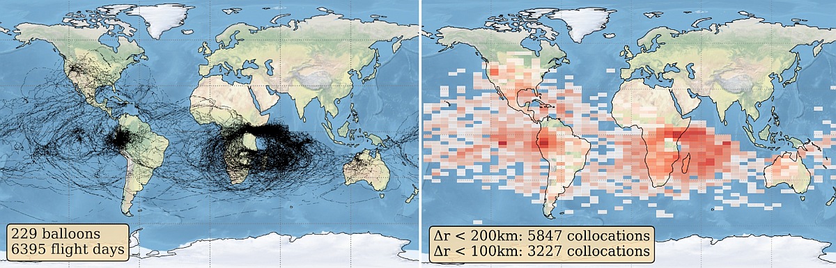 Recently, the Leibniz Institute for Tropospheric Research published a research article on which the group compares data from the AEOLUS satellite launched in 2018 with wind observations from project Loon's stratospheric balloons (image at right). The wind satellite Aeolus has a powerful laser on board, called ALADIN which is the first Doppler wind lidar in space to provide profiles of horizontal wind speed from the Earth's surface or from the top of thick clouds up to a height of about 30 km on a global scale. In the study, data obtained from 229 stratospheric balloons of the Project LOON flown between July 2019 and December 2020 above tropical Latin America, Atlantic Ocean, Africa and Indian Ocean was used to compare Aeolus measurements in the same time/spatial frame (see image below).