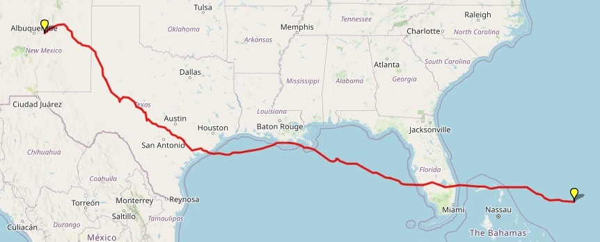 On December 12, Aerostar, the South Dakota balloon firm made a night launch from its never-disclosed facility in Santa Fe County, New Mexico. The balloon, a Thunderhead balloon with identification HBAL-614, crossed Texas, the Gulf of Mexico, Florida in a few days and after flying over the Bahamas it entered the Atlantic Ocean, where it was last detected in flight at 1:36 p.m. utc on December 18. Below we can see a map of its route. It will emerge elsewhere at some time?, we'll see.