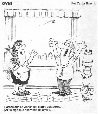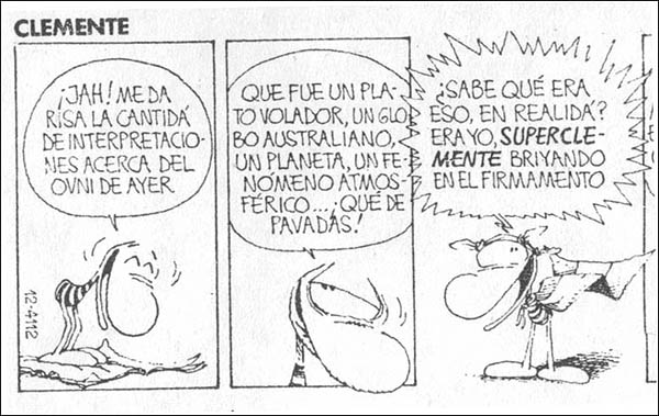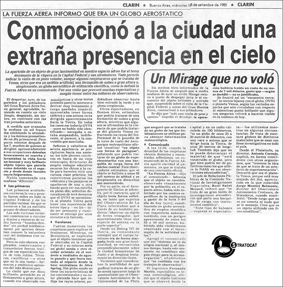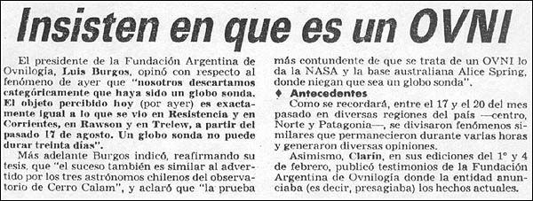 En otro recuadro destacado en el centro de la pagina, bajo el titulo de "Insisten en que es un OVNI" se exponía la vehemente opinión de Luis Burgos, Presidente de la Fundación Argentina de Ovnilogía (que recordemos aún en ese momento no tenía en sus manos una pieza fundamental de evidencia como veremos en el próximo capítulo) descartando categóricamente que se tratara de un globo sonda, mientras que mas abajo se citaba la opinión de otro de los investigadores y protagonistas del caso: Carlos Demaría director del Centro Argentino Investigador de Fenómenos Extraterrestres (CAIFE) quién en esa oportunidad afirmó que el objeto era "...un satélite destinado al estudio del Cometa Halley...", opinión que meses después con mayores evidencias en sus manos cambiaría por la hipótesis Globo. El articulo incluía imágenes de transeúntes mirando ensimismados hacia arriba y un recorrido anecdótico, no exento de humor, por los diversos llamados telefónicos recibidos en la redacción del diario. Finalmente y también en plan humorístico, "Clemente" un popular personaje de historietas se hacía eco de lo sucedido el día anterior desde la contratapa del matutino.