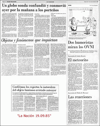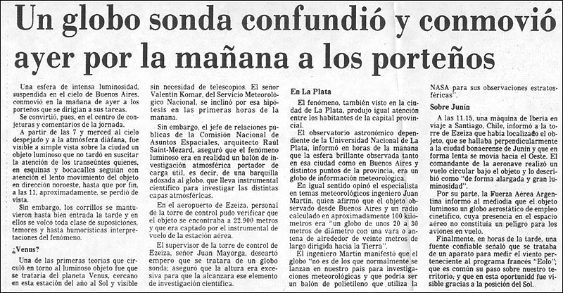 Otro tanto ocurrió con La Nación, que le dedico las tres cuartas partes de la pagina 14 bajo el titulo de "Un globo sonda confundió y conmovió ayer por la mañana a los porteños". Alli se mencionaban los aspectos generales de lo sucedido el dia anterior y se citaban varias opiniones de expertos e instituciones: