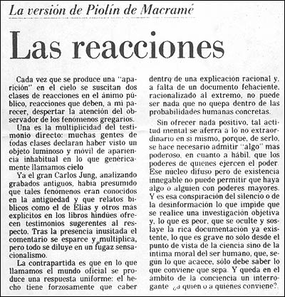 La crónica finalizaba con una información recibida por dicho matutino de una "fuente confiable" (otra más !) que afirmaba que el extraño objeto sería un globo para medir el viento perteneciente al programa francés "EOLO" (sobre esto volveré más adelante). En dos recuadros separados de la nota principal, la crónica humorística del suceso estuvo a cargo del dibujante Carlos Basurto, en tanto que la pluma de "Piolín de Macramé" (seudónimo del Dr. Florencio Escardó un ávido defensor de la hipótesis ET) trataba de darle una significación excesivamente conspirativa al suceso.