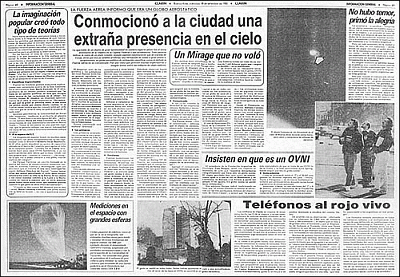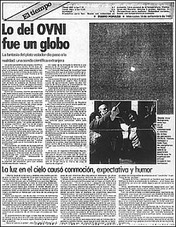 Con una graciosa composición gráfica en tapa que mostraba una foto del OVNI y a un improvisado testigo asomando su cabeza hacia el cielo desde la ventanilla de un colectivo (asi se denomina a los omnibus en Argentina), el "Diario Popular" en su edición del 18/09 titulaba para desazón de muchos "Lo del OVNI fué un globo" reproduciendo más o menos lo mismo que los demás matutinos y mencionando dos hechos importantes: que el objeto había sido detectado por un radar de la Armada a una distancia de 55 kilómetros de la ciudad y que 2 aviones Mirage hicieron vuelos de aproximación hasta los 10.000 metros pero "...sin que trascendieran los informes que dieron sobre el aparato...". En otro apartado del mismo diario, bajo el título de "La luz en el cielo causó conmoción, expectativa y humor" el cronista analizaba -con bastante ironía y humor- lo sucedido en los cielos porteños en el contexto de la actualidad de esos días.