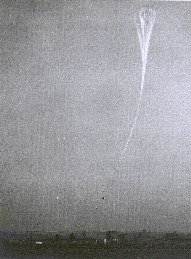 The Emma V was chattering volubly on the truck's radio every ten seconds, as saucy and repetitious as a parrot. Her gondola was to be cut down automatically at 4:00. Precisely at 4:00 the radio in our truck blared, "She's been cut down" -the C-47 was talking- but we were looking straight at her and we knew this was not true. Through the theodolite, we could plainly see the gossamer-like thread with two or three molecule-sized glistening objects hanging from her bottom. The minutes passed, and the Emma V was still holding on to her load. An hour passed, and another, and she remained obstinate. This had never happened before.
