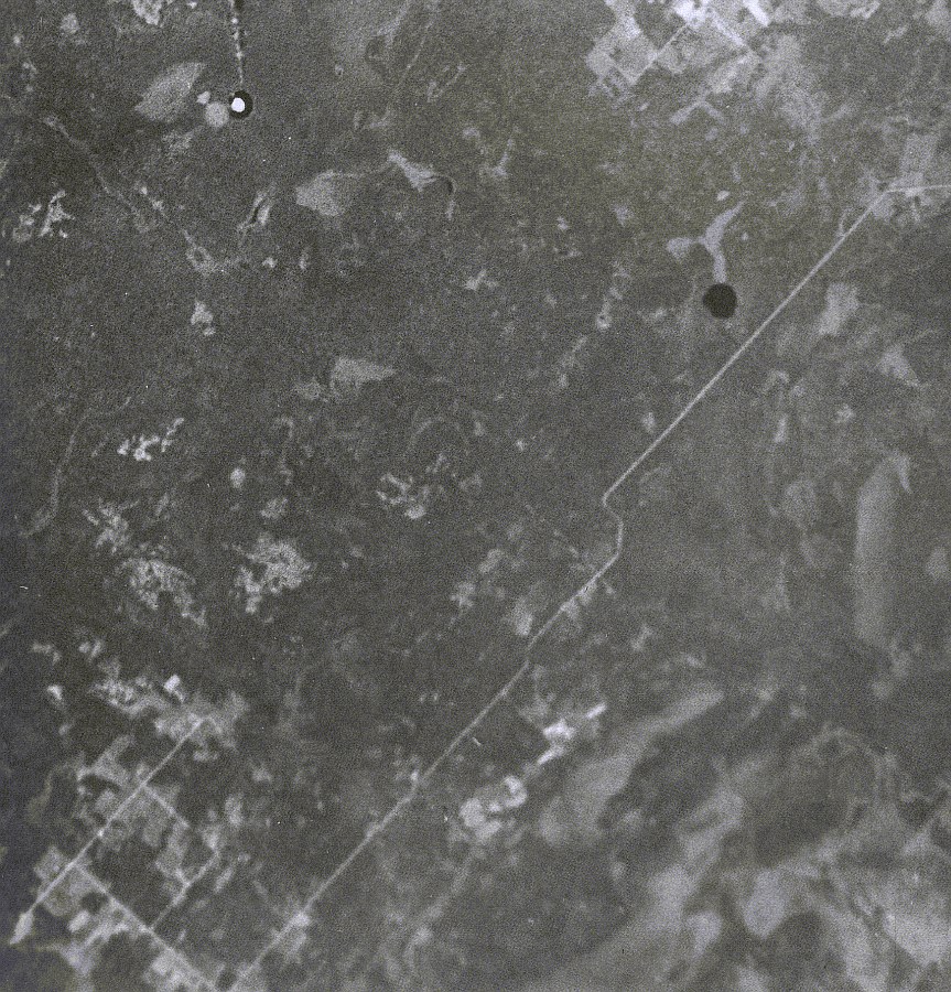 At the driver's insistence, we decide to reconnoitre the sky from the sister hill across from the cemetery. We unfasten the rickety gate at the base of the hill, drive in along parallel indentations which we refer to euphemistically as a road, get to the top, and step out of the truck gingerly, for we find that this has been a favorite idling spot for cows. Major Simons changes clothes and shoes, metamorphosing into a lumberjack. A second pair of socks is put on by Lt. Lebish in readiness for a dash through cockleburr laden wheat fields. Dr. Hild adjusts a telescopic lens on his camera. Chief Serley, one of the drivers, puts on a red baseball cap, which matches the color of the luminescent cloth thrown over the top of the truck to attract the attention of the C-47 and the Navion.