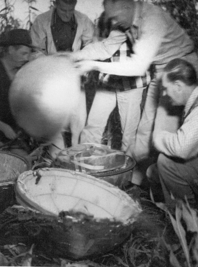 We start on one of the gondolas. The farmers pitch in and help. Four of us remove, as quickly as we can, the 134 bolts which seal its upper and lower halves. We raise the lid and discover life inside. While one of us places the mice (90 of the 93 are still living) in more comfortable quarters, the others remove the insulating jacket of the second gondola. The gondola is icy cold. There is not much need to remove those 134 bolts rapidly, but we do so anyway. The farmers are asked to send their children for a pail of water, so that they will not be there when the gondola is opened. The conditions inside the gondola are as anticipated. Even Dr. Hild's tissue cultures all 40 of them are frozen solid. Hild -a buffalo-chested and bull-necked, with a deadpan expression concealing a sharp wit- picks up one of the cultures, turns a flashlight on it, examines it with a practised eye, then replaces it without so much as curling his lips. He has had disappointments before. His long experience as torpedoman on a German PT during the war had taught him to accept situations as he found them.