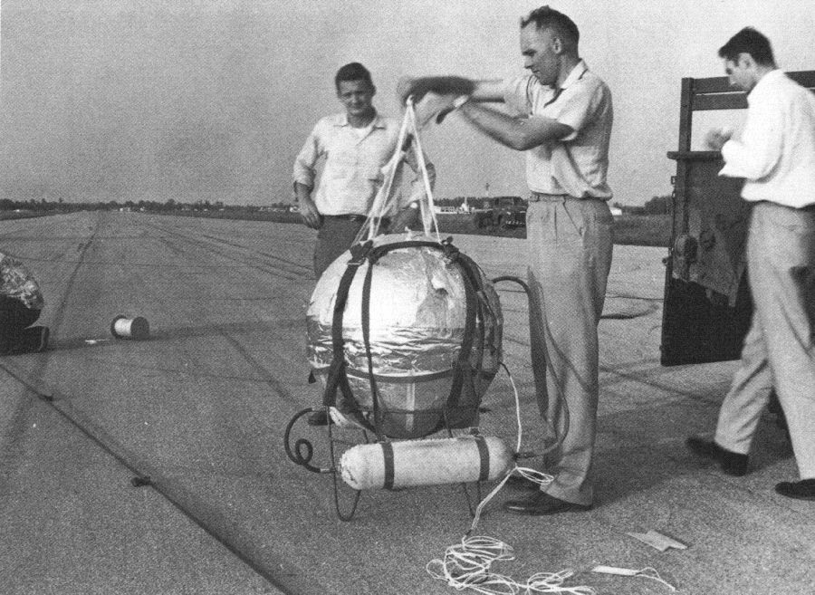 In one of the vans, interest was centered on getting the first gondola ready. Airmen John Goldsmith and Jerry Johnson were working on the upper half of the 3-foot aluminum sphere, in the top of which were the tiny instruments that were to record simultaneously on a smoked disc the temperature and the pressure in the gondola, and, powered by silver-cell batteries, were to send this information in the form of coded messages to the radio beacon on the balloon's load line, for transmission.