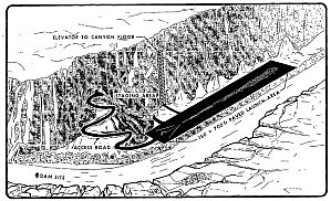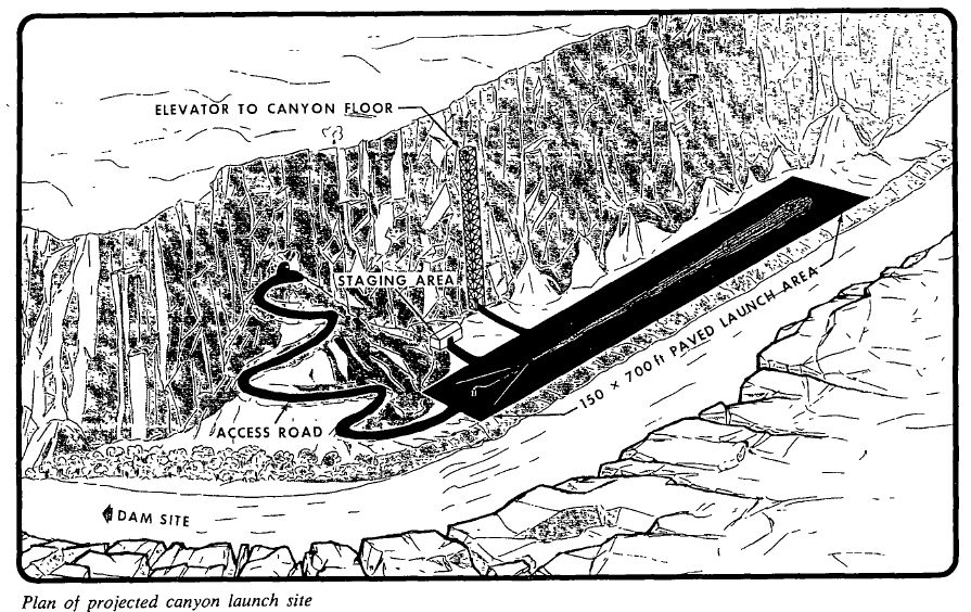 En la imagen de la izquierda podemos ver una reproducción artística de las instalaciones proyectadas para el sitio del cañon (click para ampliar) que incluian un elevador para descender equipos y personal a la zona de lanzamiento. Cuando el Panel aprobó los planes de desarrollo tuvo en particular consideración el hecho de que sería significativamente mas económico construir las instalaciones del Aeropuerto, que las del cañon, a pesar de lo cual recomendó que de todos modos se negociaran los derechos de uso de dicha zona en el caso de que fuera necesario utlizarla para lanzar balones portando sofisticados instrumentos que requirieran un sitio protegido como ese. Para el año fiscal 1965 fueron asignados al proyecto Page un total de $ 65.000.