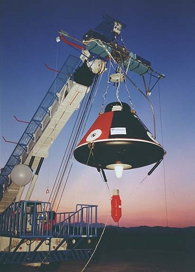 Two years later a new kind of mission would be intended. As balloons launched from Trapani in most cases were flown over open sea spaces, at some point was studied the posibility to carry out balloon flights transporting instruments and payloads to be droped from high altitudes. During those years the French firm Aérospatiale was working on behalf of the European Space Agency (ESA) in a capsule (which resembled the Apollo capsule) known as the Atmospheric Reentry Demonstrator (ARD) designed to test and qualify new technologies and flight control capabilities for atmospheric reentry and landing. Although the full scale mission was projected to be tested in a real reentry from Earth's orbit after being launched by an Ariane rocket, a first drop test from a balloon was planned to be performed at sea.