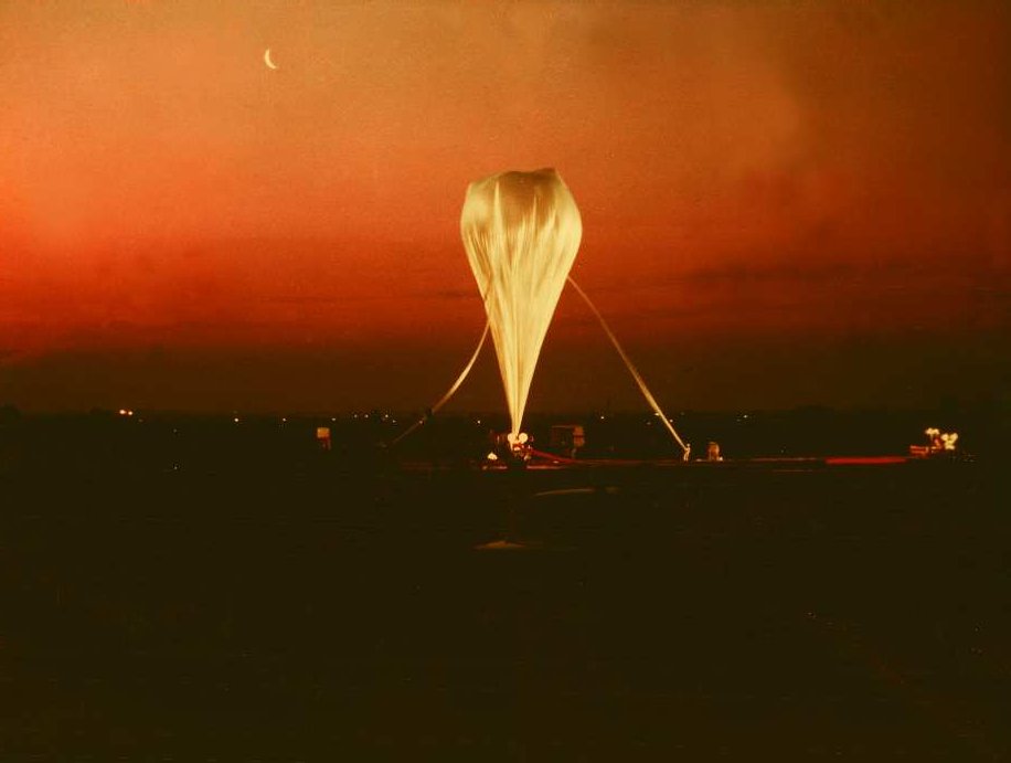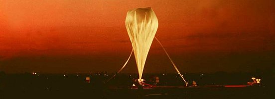 A second campaign the next year, performed two more flights which lasted 75 and 104 hours aloft. One of them -launched on 16 August- was carrying a multi-instrumented gondola with several experiments from Italian Universities. That mission made history because by chance during the flight was detected for the first time a radio frequency gamma-ray burst of non-solar origin. Above at right can be seen the pre-launch operations of the flight while the beautiful image below shows the balloon at dawn while being inflated (both images click to enlarge).