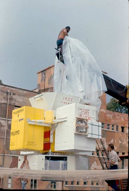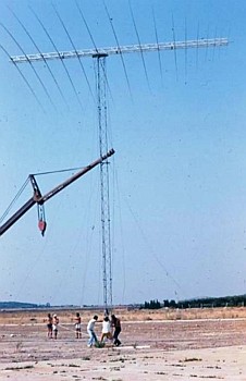 The tracking of the flight was done using the worldwide OMEGA navigation system while for telemetry and scientific data transmission was used a low bit-rate HF system which except for some gaps in mid-ocean, worked acceptably well. One of the HF receiving stations was located at Trapani, while in the other side of the Atlantic the NSBF was allowed to use the facilities of the Naval Research Laboratory in Chesapeake Bay, Maryland. At left above can be seen a picture of the antenna array at Trapani while being mounted (click to enlarge).