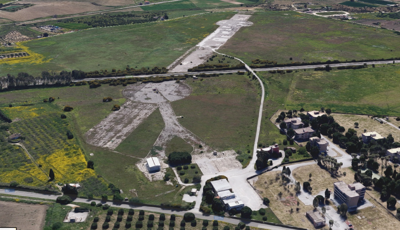 Below can be seen an actual satellite image of the former Base's layout. The long inclined portion of clear terrain is the former strip of the military airport. Remarkably, still are clearly visible the marks of explosions left by the allied bombing raids we mentioned before.