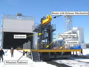 The launcher platform measuring 8 m wide and 10 m long, with a total weight of 50,000 kg, consists of a boom, two elevators, and a turntable. The boom has a release mechanism with a load cell at the top of a 4 m long arm. The boom can sustain a payload up to 2,000 kg and can hold a lift up to 3,000 kg at an arbitrary angle between horizontal and vertical. At left can be seen a detailed view of it (click to enlarge). The boom can tilt at a speed of 10 degrees per second while the two elevators, one for the payload stage (4 m wide, 3 m long) and the other for the boom, can lift up about 4 m synchronously or independently, according to the conditions of the surface wind and the payload height. The turntable on which these are mounted can rotate endless at a speed of 1 rpm.