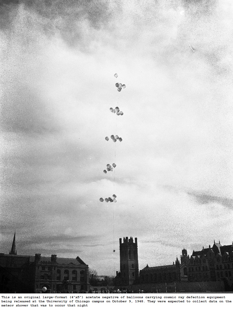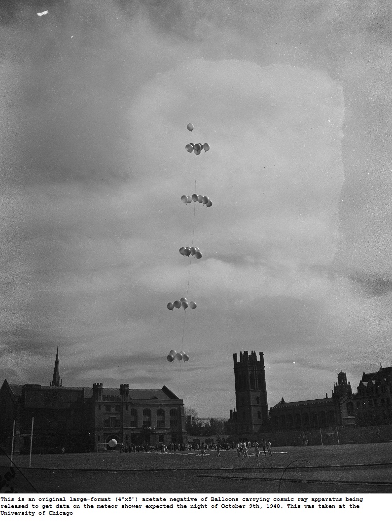 The reference for this flight came from two old 4" x 5" acetate negative of balloons carrying cosmic ray detection equipment being released at the University of Chicago campus on October 9, 1948. According to the caption, it was expected to collect data on the meteor shower that was to occur that same night.