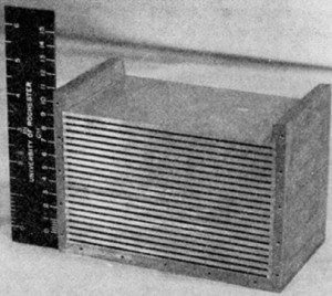The payload consisted of the box shown at left. This box was made of 20 brass plates 3 mm thick and accurately spaced by a brass frame. Below each brass plate a nuclear G-5 emulsion of 100 microns of thickness mounted on a glass plate 4 inches x 6 inches and 1.3 mm thick was inserted.