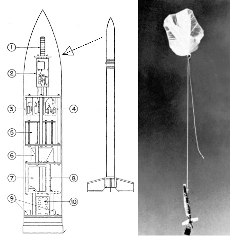 The objective of this flight was to perform absolute measurements of the total intensity of charged primary cosmic rays, extending to the lowest feasible levels of magnetic rigidity. The PAYLOAD included a Victoreen 1B85 Geiger counter housed in the rocket's nose section. This section, approximately conical in shape, was pressurized, detachable, and had a volume of about 2.5 cubic feet. The schematic diagram at left above illustrates the internal distribution of instruments: (1) Geiger Counter, (2) Thin fiber plate and cathode follower, (3) Circuitry, (4) Audio-oscillator for the radio transmitter, (59) Batteries, and (10) Telemetry transmitter. Additionally, a small rocket-firing gondola -containing a timer, barometric pressure switch, and firing batteries- was suspended from the rocket's tail fins by a lightweight cord, allowing the rocket to detach cleanly when fired.