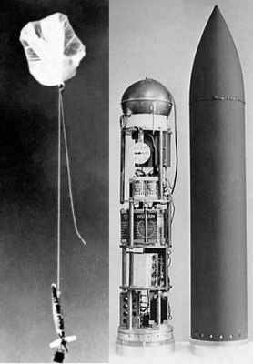 The purpose of this flight was to obtain an absolute measurement of the total intensity of charged primary cosmic rays, extending to the lowest feasible value of magnetic rigidity. The SCIENTIFIC PAYLOAD was housed in the nose section of the rocket, which was pressurized, approximately conical in shape, detachable, and had a volume of about 2.5 cubic feet. This payload included a spherical ion chamber at the top, followed by a box containing the associated electronic circuits located behind the pressure gauge. The next three decks were allocated for batteries, while the lower deck contained the telemetry transmitter. An image of the setup can be seen on the left above.