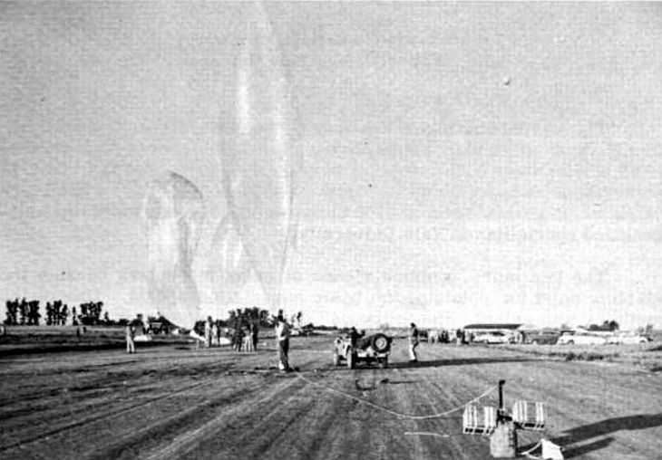 The balloon was launched at 6:40 CST on September 3, 1952, at the General Mills Flight Facility in the University of Minnesota airport near New Brighton. While the balloon was being inflated, shifting winds caused excessive handling of the fragile material and holes appeared approximately 30 feet from the apex of the balloon. It was decided to launch the balloon in order to observe the feasibility of the experimental launching technique, but the valuable scientific instruments were detached prior to take-off.