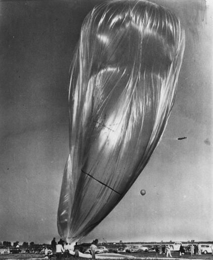 The so-called GIANT SKYHOOK mission was a test flight of a 3.000.000 cubic feet balloon manufactured by General Mills. At the time it was the largest one ever made. The balloon measuring 178 meters in diameter was made of polyethylene plastic 0.001 inch thick and designed to float at an altitude of 120,000 feet