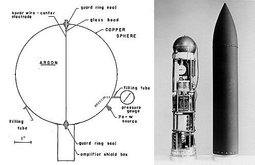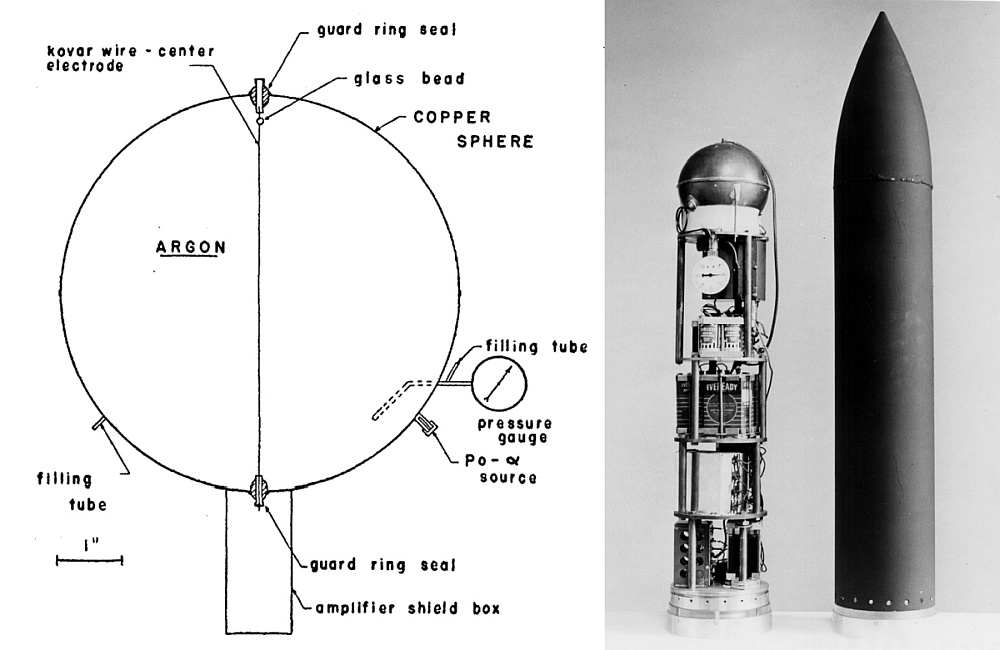The SCIENTIFIC PAYLOAD of the rocket in this flight was a sophisticated thin-walled pulse-ionization chamber designed to measure the intensity and characteristics of heavy primary cosmic-ray nuclei at high altitudes. In the image above we can see an scheme and a picture of the device. The chamber was constructed from thin copper hemispheres, six inches in diameter, with a wall thickness of 0.010 inches to minimize interference from surrounding materials. A central electrode made of 0.025-inch Kovar wire, soldered into a precision guard ring system, facilitated accurate ion collection. The chamber was filled with ultra-pure argon gas, and counted with a polonium alpha source for absolute calibration for ionization bursts. The source emitted alpha particles through a collimating aperture, producing consistent and measurable bursts that enabled pre-flight and in-flight calibration of the system.