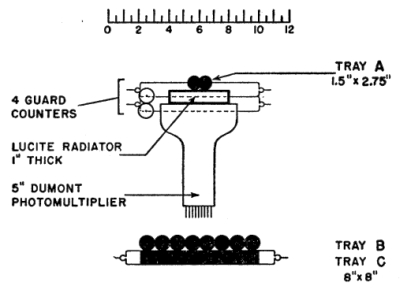 Trays A, B, and C, which are shown in solid black in the figure at left, formed the Geiger counter telescope. The equipment recorded only those events which caused a coincidence between these three trays. Thin-wall counters were used in tray A to reduce the number of nuclear interactions occurring just above the radiator. Between trays A and B was the Cerenkov counter. The radiator was a cylindrical slab of Lucite 4 inches in diameter and 1 inch thick. The Lucite was optically coupled by a film of Canada balsam to the cathode of a Dumont K1198 photomultiplier.