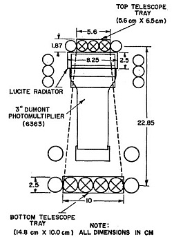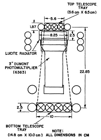 The core of the apparatus was formed by the Cerenkov detector which consisted of a Lucite block optically coupled to a photomultiplier tube. The Cerenkov detector was placed between the two trays of a Geiger counter telescope whose axis was vertical. Finally the guard counters were arranged according to the figure at left. The electronic circuitry was such that if a particle passed through any of the guard counters simultaneously with a telescope coincidence the corresponding Cerenkov output pulse was "marked". Shower detection was accomplished in the following manner: if two or more counters in either the bottom or the top tray were triggered simultaneously the associated circuitry was such that the corresponding Cerenkov output pulse was "marked" in a manner similar to that for a guard count.