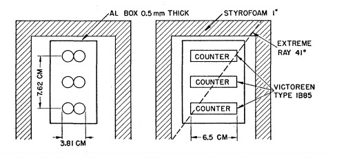 The instrument used in the flight which can be seen in the scheme at left was a vertical counter telescope designed for high-altitude measurements. It was constructed with an exceptionally low total stopping power of approximately 0.2 g/cm², including the casing, allowing it to detect low-energy radiation with minimal shielding effects. The telescope was sensitive both to charged particles and, to a lesser degree, to gamma radiation due to Compton scattering events that could produce coincident counts. Its efficiency for detecting vertically incident Co-60 gamma rays was very low, at about 0.05%, while for charged particles passing within its defined acceptance angle, the detection efficiency was assumed to be 100%. The telescope subtended a solid angle of 9.38 steradian cm² for isotropic radiation, determined by its mechanical and electronic design. The instrument assembly was housed inside a lightweight, 0.5 mm thick styrofoam container to minimize additional material and preserve the desired low stopping power. Detection elements inside included Victorine Type IB85 counters, strategically arranged to maximize the probability of capturing throughgoing particles while minimizing the detection of background noise. Prior to the flight, the apparatus underwent thorough testing to ensure operational integrity and was confirmed to be fully functional upon recovery after the mission, lending strong confidence to the data collected.