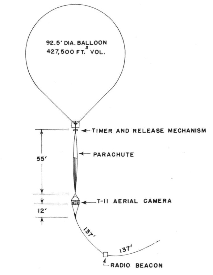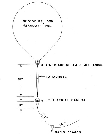 For this experience ERDL provided a standard 6-inch focal-length T-11 mapping camera. A diagram of the entire flight train is shown at left. The camera was rigidly mounted in a 30-inch diameter spherical gondola which was in turn suspended below the balloon using an unpacked but collapsed parachute as a means of suspension. The top of the parachute was connected to the apex of the lower conical surface of the balloon through a mechanism which automatically released the balloon and permitted the gondola to parachute back to earth after a preset time lapse.
