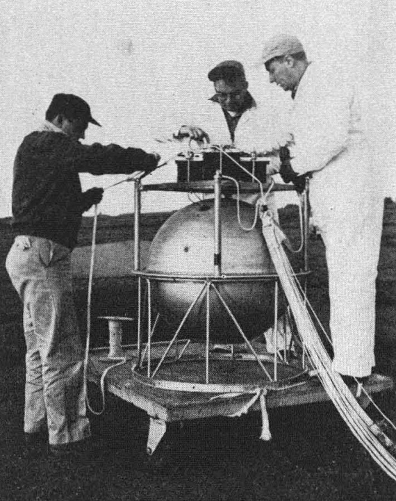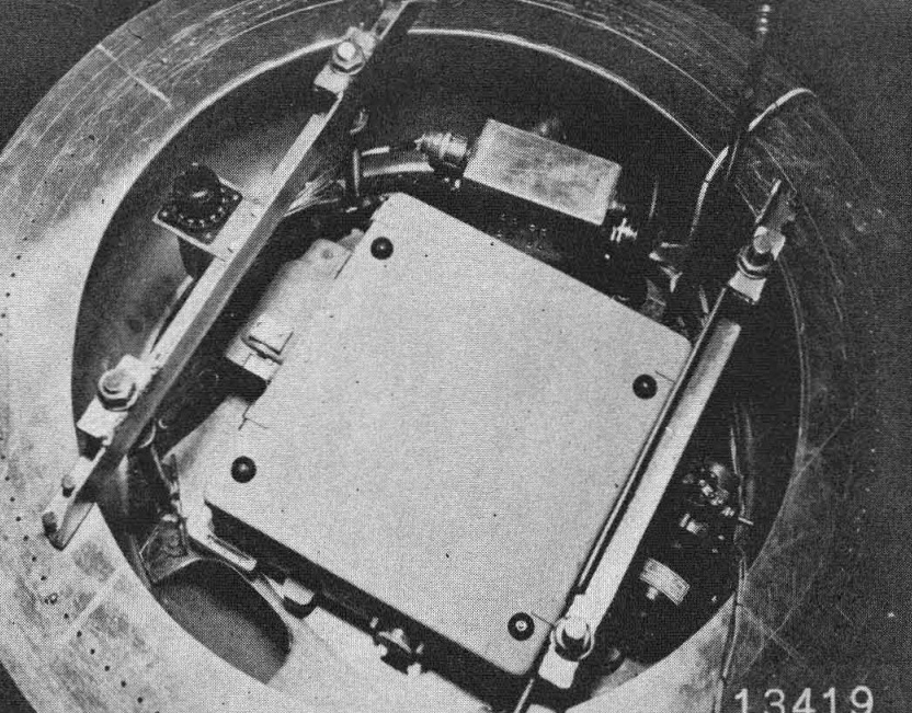 The sealed spherical capsule, containing a T-11 6-inch Metrogon camera, being prepared for flight. A rack containing storage batteries straddles the top half of the sphere, and a shock-absorbing structural framework was built around the bottom half. A top view of the camera, with magazine removed. showing the top of the camera and some of its auxiliary equipment. The balloon release The gondola, parachute and balloon immediately following its release.
