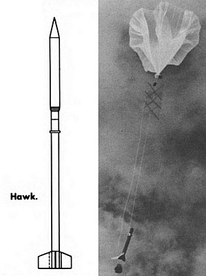 The rockoon firings during the 1957 campaign used an improved version of the LOKI vector denominated HAWK. It was a sounding rocket developed by the Jet Propulsion Laboratory for the Army Ordnance Department, manufactured by Grand Central Rocket Co. and Cooper Development Corp. It was designed to carry a 8.5 pound instrument load to an altitude of about 75 miles. It counted with larger fins than the original LOKI design for stability at high altitudes and had a solid propellant rocket motor with 2.200 lbs of thrust. Its total length was 8.3 ft, diameter 3.5 inches and fin span was 1.1 feet. The Hawk was capable of attaining speeds about 3.000 mph, and altitudes of 70 miles when fired from a balloon floating around 70.000 ft.