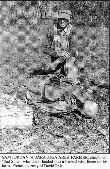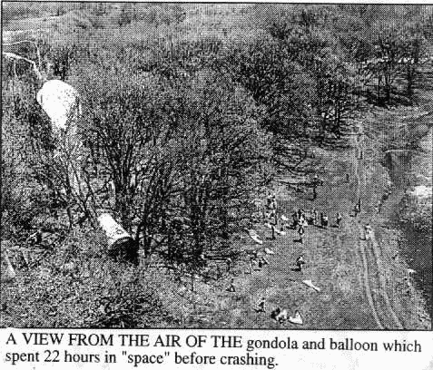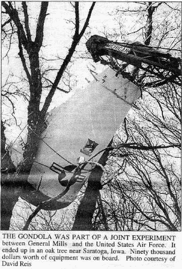 Finally the balloon touched ground around 3 a.m. near Saratoga, Iowa. The complete flight train was strung up in the oak trees and the dummy landed in Sam Jordan's farm, 22 hours after it had been launched.