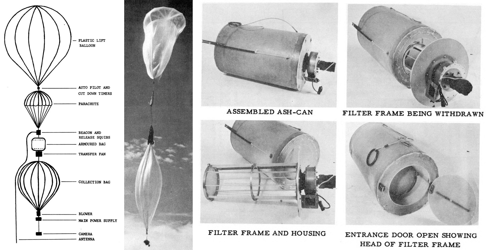 General Mills engineers designed also the first "Ashcan" filter sampler (which we can see in the images at bottom left) which was flown operationally from November 1956 until December, 1959. This sampler utilized a Torrington 403 blower to pull air through five square feet of low background, low pressure drop filter paper. Sampling rate depended upon altitude and voltage applied, but averaged between 500 and 600 cubic feet per minute. After discovery in the laboratory of some inconsistencies in the volumes measured, in later models of this instrument were incorporated 40-foot exhaust ducts to prevent re-entrainment of sampled air. Also in later years the collector unit was modified and improved many times.