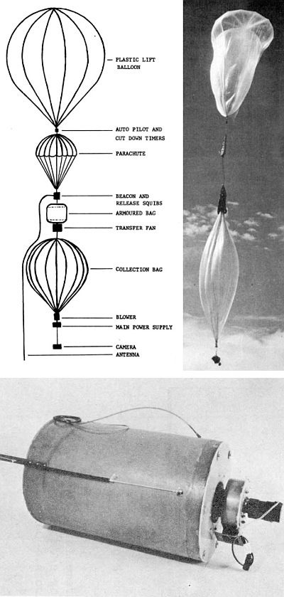 The collection system for the program was developed by General Mills, Inc. and consisted of four major components: a lift stratospheric balloon, a collection bag, an armored vessel, and a control unit. The key concept behind the program was to suspend an uninflated envelope beneath a large helium filled balloon, and carry the envelope to high altitude to fill it with ambient air. An autopilot would then initiate the descent of the entire system to recover the samples on ground. The image at left shows a schematic description of the sampling system along with one of the balloons during descent.