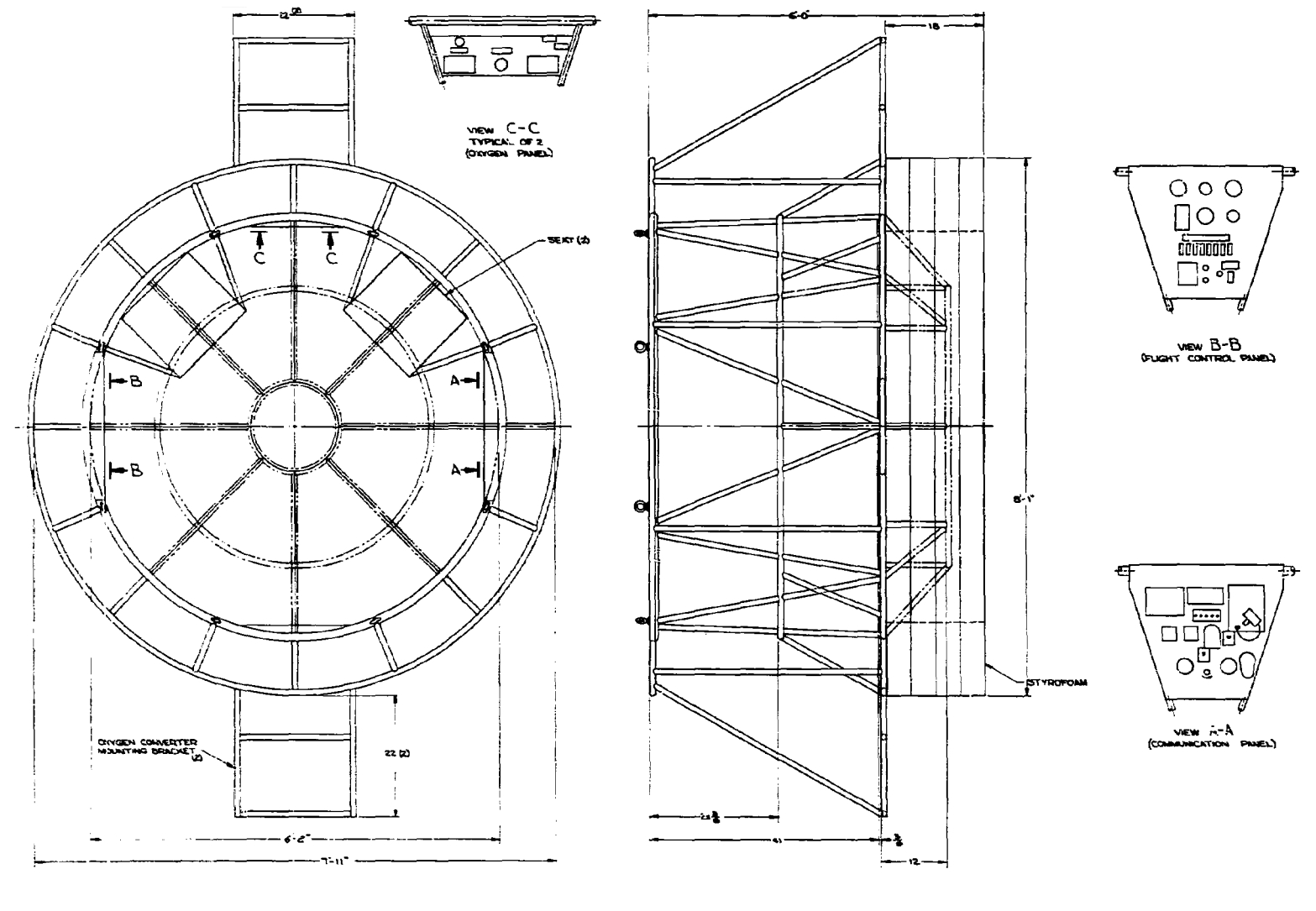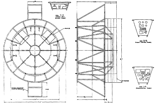 The platform for the mission was a Winzen Research open gondola denominated Sky-Car II. It was a bigger version of the two seat Sky-Car gondola developed in 1956 by Otto Winzen to support low-altitude scientific research and ballooning instruction. It was originally equipped and instrumented for conducting flights to approximately 40,000 feet with a crew of four. The basic gondola structure in shown in the scheme above left (click to enlarge). The inner framework was made of steel aircraft tubbing, while the outer frame forming the maximum eight foot diameter was made of aluminum. The under-carriage in the form of a circular ring was constructed from styrofoam.