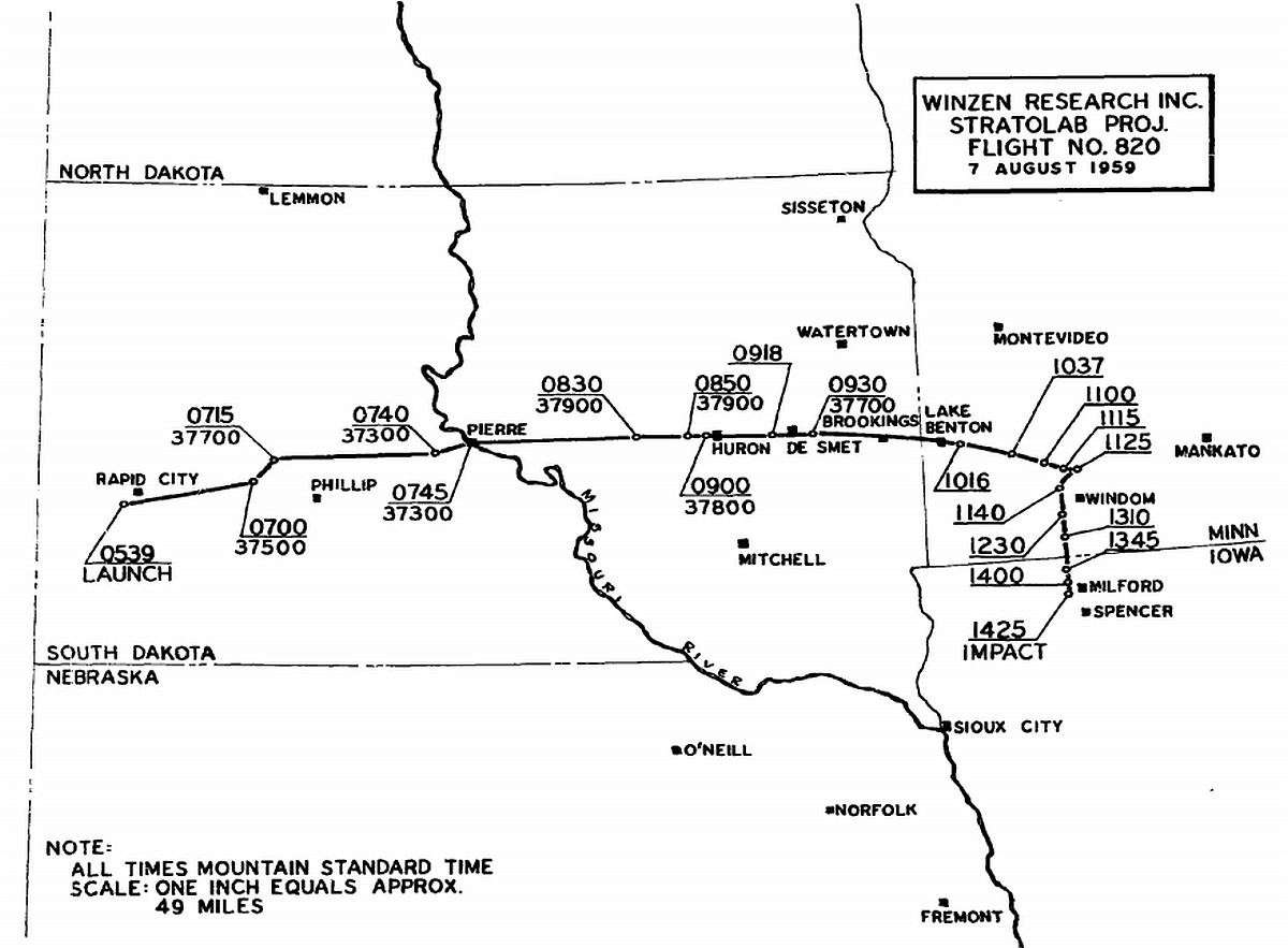 The balloon was launched at 5:40 MST on 7 August 1959, from the Strato Bowl located near Rapid City, South Dakota.