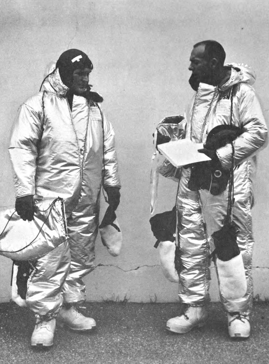 The unique design of the clothing featured two layers of rubberized fabric, so arranged that a spring-like plastic spacer held the two layers apart. Both surfaces of the rubberized fabric had been coated with a thin aluminum film. At altitude the assembly worked in a manner somewhat similar to a thermos bottle. The aluminum film served to reflect the sun's heat in the daytime and at night it would serve to reduce the lose of heat from the man. The material had approximately the same insulation value as conventional woven or fur like material but with about one-half the weight.