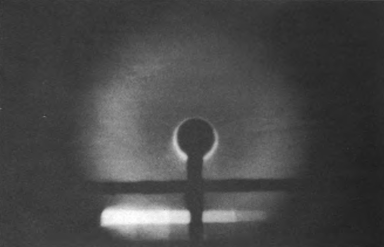 Cooper and Ross wearing the Navy's new lightweight, high-insulation garment designed for wear on high-altitude balloon flights just before the flight. Inlation of the balloon for the mission at the Strato Bowl, near Rapid City, South Dakota. Image obtained during the flight. The sky near the sun is the smooth bright area above the horizontal dark bar. The sun is eclipsed by the dark disk in the center of the frame. The support for the occulting disk is seen as a vertical, dark bar