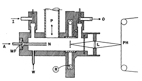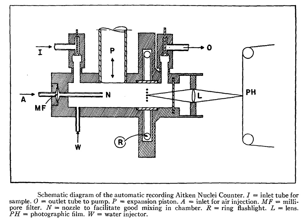 The schematic diagram at left show the essential parts of the counter (click to see details). It consisted of a cylindrical chamber, 12.6 cm long and 2.8 cm in diameter, expanded by the action of a piston (P) at a ratio of 1,23. Operation of the nuclei counter was continuous and autonomous during the balloon flight, according to the following cycle: before and after expansion, the valves (I and O) were opened, and the chamber was flushed with outside air at the rate of 50 cm3 per sec for 20 sec. Air entered the chamber through a half-inch intake tube, about 12 inches in length. Valves I and O were then closed and clean air (A) from a tank was injected for 4 sec, raising the pressure of the chamber to one-half atmosphere above ambient. The air was allowed to rest in the chamber for 5 sec for mixing and moistening and then the piston was withdrawn, causing expansion. About 0.3 sec after expansion and consequent formation of the fog, a high-intensity strobe light (R) illuminated a cylindrical section of the chamber about 1.5 cm long, which was photographed by a 35-mm Beattie-Coleman camera (PH) together with the time and the frame number. Finally, water (W) was injected from a reservoir tank into the chamber, and the cycle was repeated. The counter was designed to take measurements on the ascent only.
