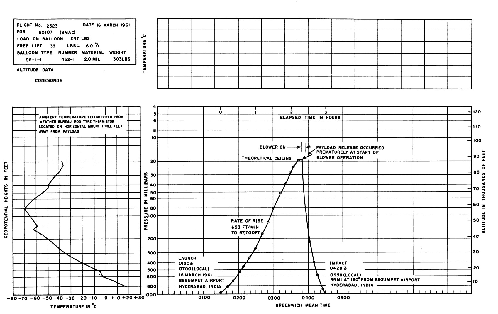Balloon was launched on March 16th, 1961 at 7:00 local time from Begumpet Airport, near Secunderabad using dynamic method. Rate of rise to 87,700 ft was 653 fpm. SMAC blower operation began at 9:18 but the payload immediately separated from the balloon and descent began by parachute. The blower continued operation until the delay-time pressure altitude of approximately 60,000 ft was reached during descent. Impact occurred at approximately 35 miles south from the launch site. The flight was completely unsuccessful because of an instrumentation malfunction. The equipment had been checked prior to flight by starting the blower and cycling all functions. All functions performed normally at this time. The system was again checked out after flight with no obvious malfunction. Time did not allowed a thorough investigation of the problem at that time and consequently the reason for premature cutdown of this flight was not known.