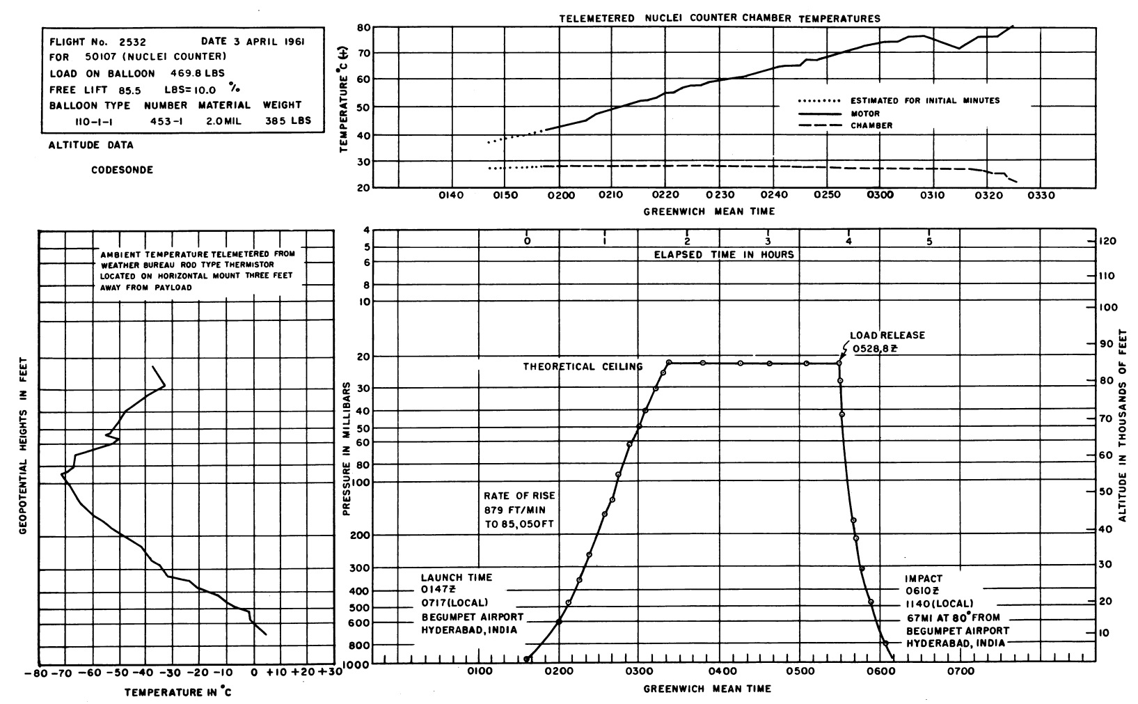 Balloon was launched on April 3, 1961 at 7:17 local time from Begumpet Airport, near Secunderabad using dynamic method. Average rate of rise was 879 fpm to 85,050 ft. Impact occurred 67 miles east of launch site.