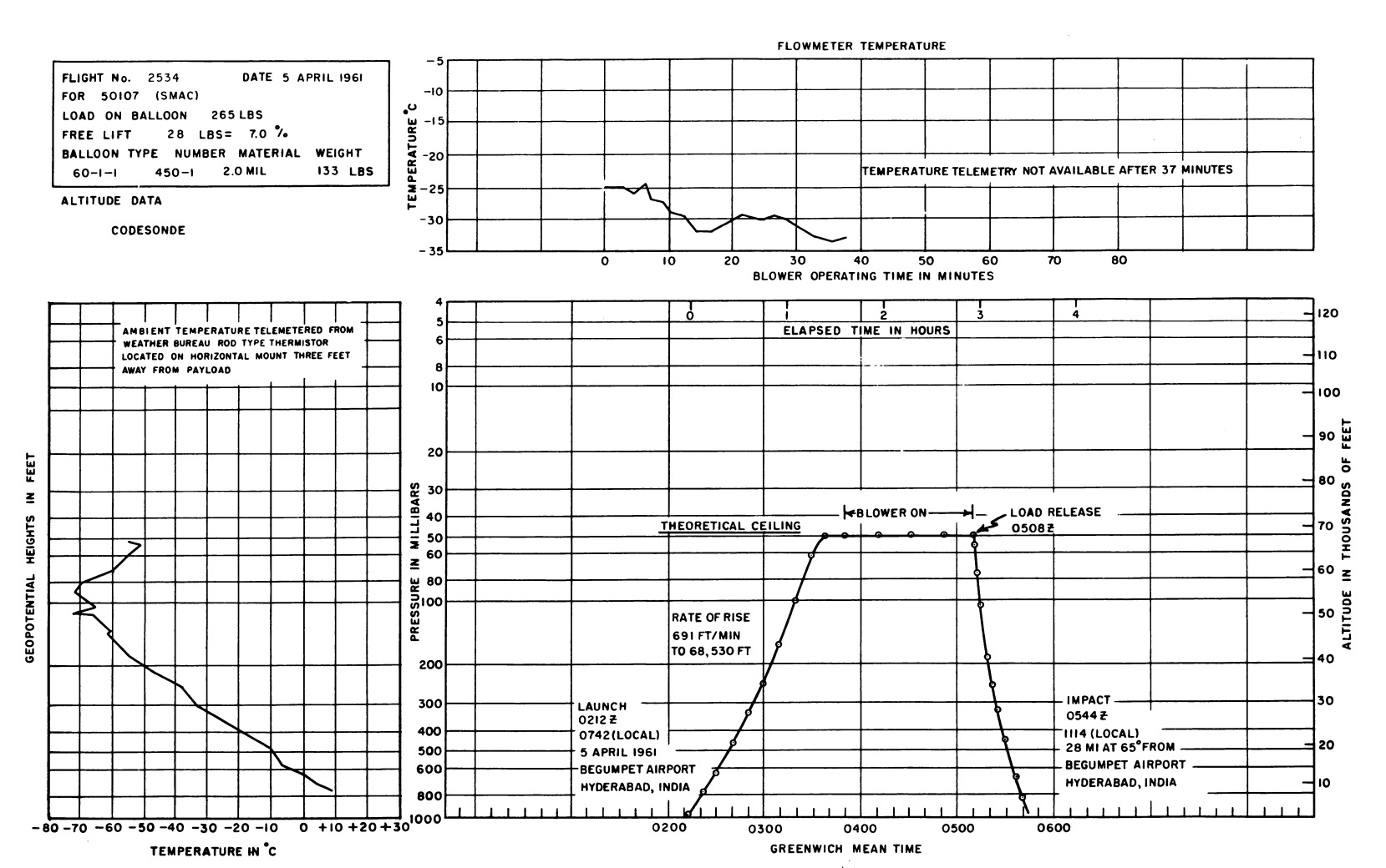 Balloon was launched on April 5, 1961 at 7:42 local time from Begumpet Airport, near Secunderabad using dynamic method. Rate of rise to 68,530 ft was 691 fpm. SMAC blower operated for 79 minutes. Load release occurred immediately and impact was observed 28 miles northeast from the launch site.