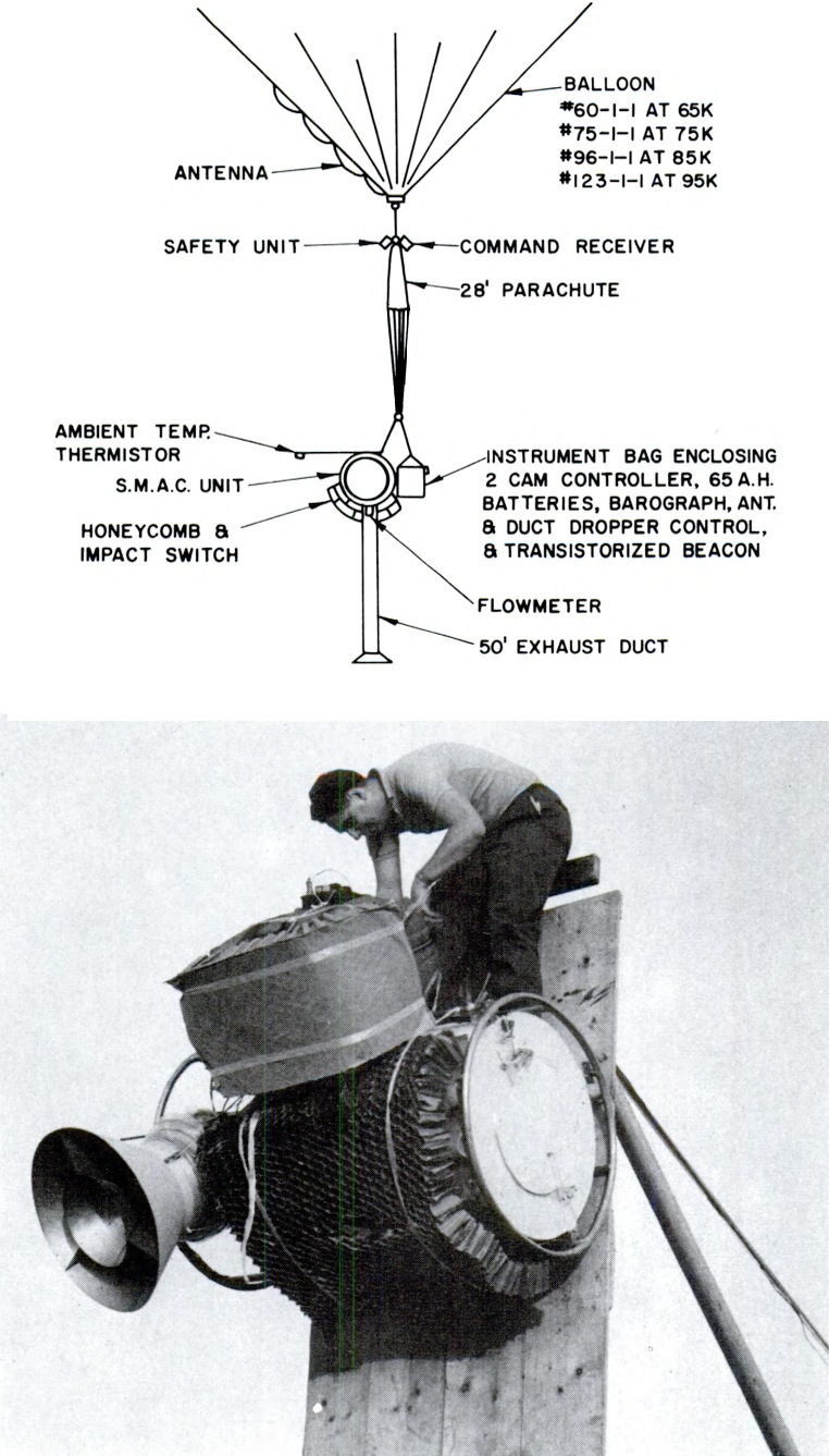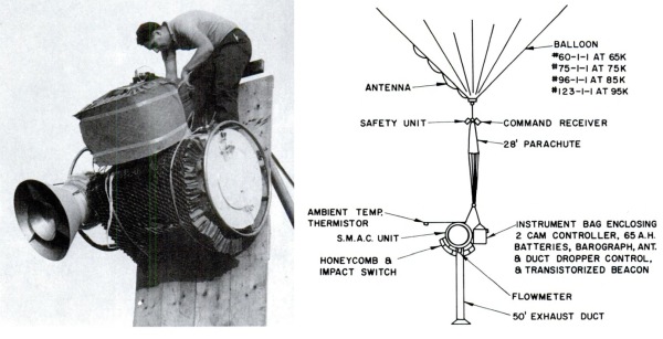 This air-filter unit used 10 square feet of polystyrene microfiber filter material produced by the Stanford Research Institute in a cylindrical configuration. The polystyrene fibers of the filter ranged from about 0.1 to 1.0 microns diameter allowing 100% collection efficiency for submicron aerosols over a wide range of particle sizes and flow rates. The prime air mover was an axial-fan blower mounted at one end of the housing so as to draw air through the filter drum at a sampling rate of over 1000 standard cubic feet of air per hour and exhaust it through a 50 ft duct suspended below the system to prevent air recirculation. At the other end of the housing, a door opened at altitude and closes upon completion of sampling. At left we can see the unit being prepared for flight and a detail of the complete balloon flight train (click to enlarge).