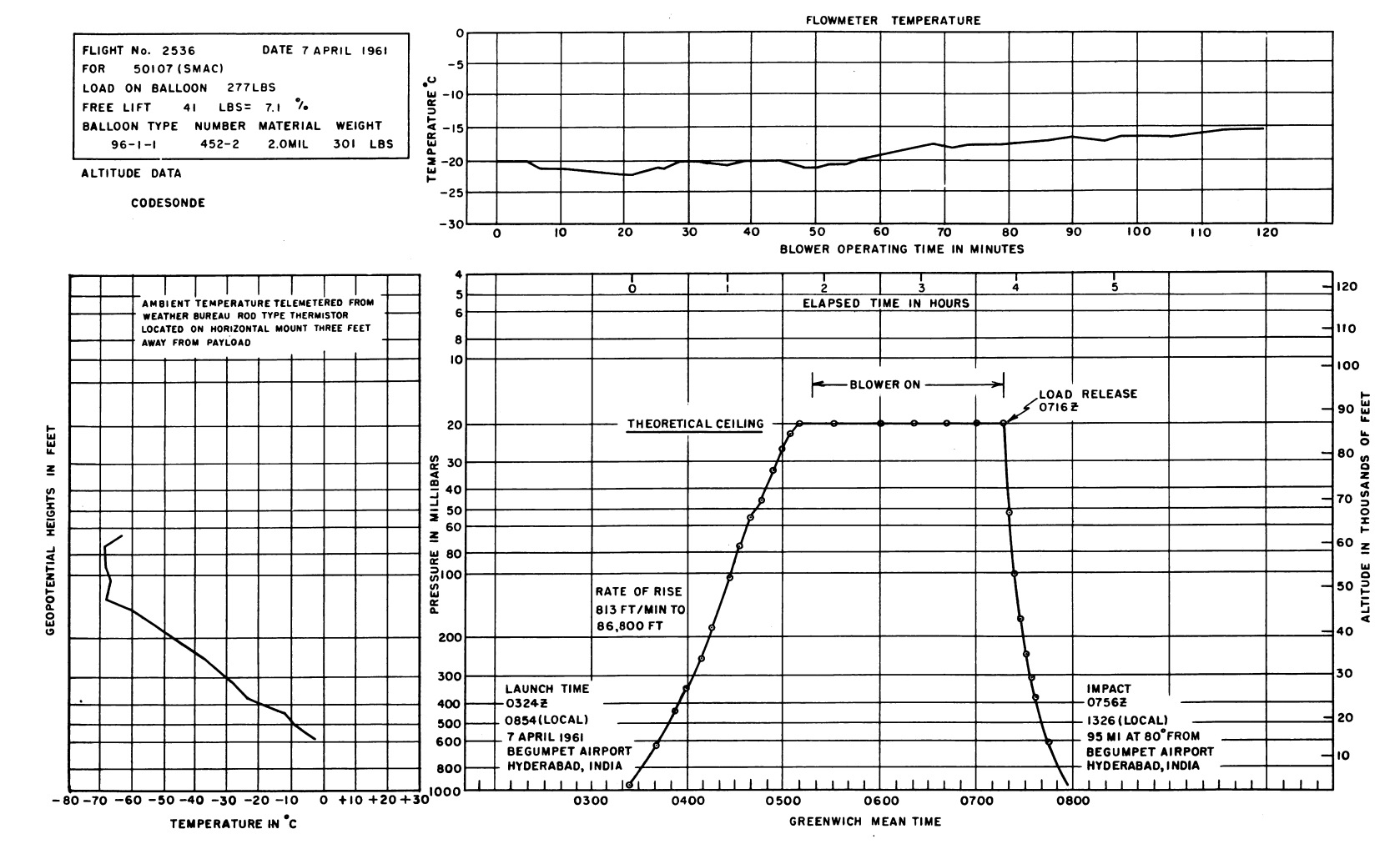 Balloon was launched on April 7, 1961 at 8:54 local time from Begumpet Airport, near Secunderabad using dynamic method. Rate of rise to 86,800 ft was 813 fpm. SMAC blower operated for 119 minutes. Load release occurred immediately and impact was observed 95 miles east from the launch site.