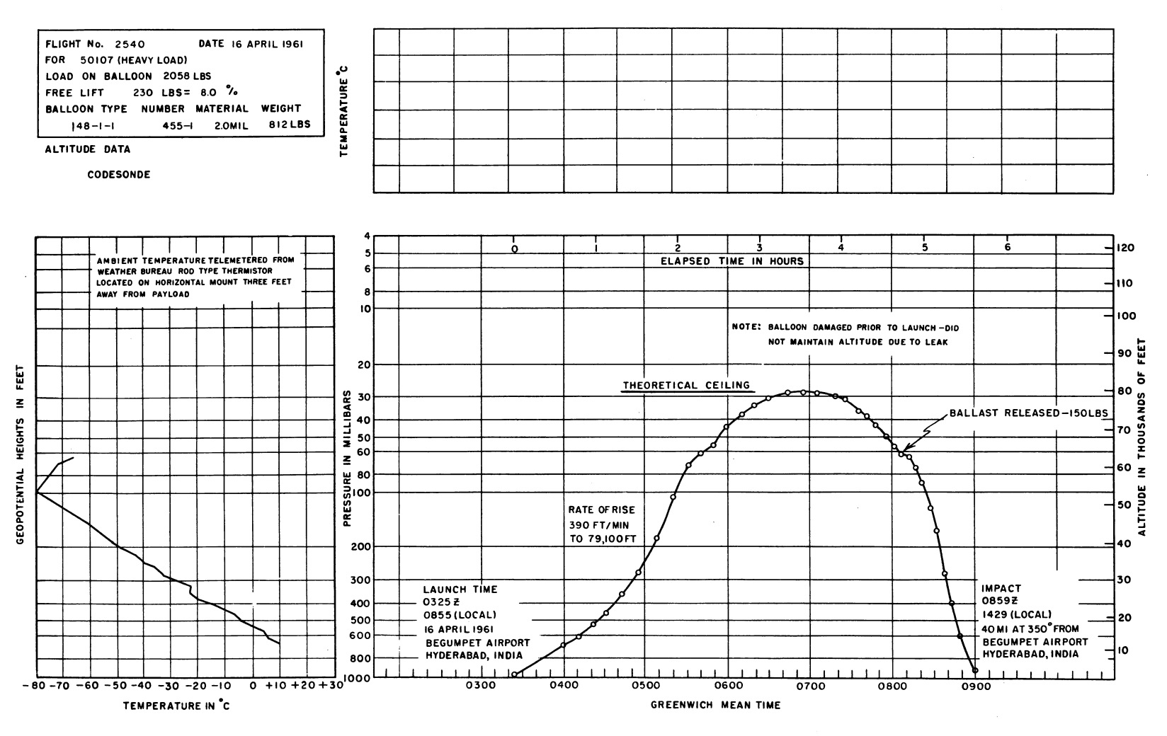 Balloon was launched on April 16, 1961 at 8:55 local time from Begumpet Airport, near Secunderabad using dynamic method. Rate of rise was only 390 fpm and it was evident that helium was escaping. The balloon leveled off at 79.100 ft but, after approximately 30 min at this altitude, it began a slow descent. The entire 150 lb of ballast was released at 65,000 ft which only momentarily slowed the descent. Impact occurred 40 miles north of the launch site.