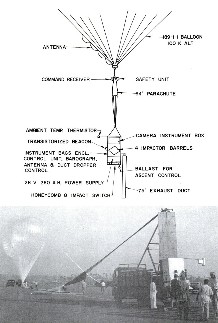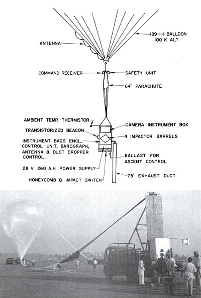 This particular flight was part of a series to mesure the vertical distribution of submicron particles in the stratosphere over India by means of a balloon-borne inertial impactor device known as the AFCRL Large Impactor which was basically a scaled-up version of the impactor air sampler developed by General Mills for the Air Force Cambridge Research Lab. modified by the addition of a backup filter. At left we can see an scheme of the flight train along with an image of the impactor at launch (click to enlarge).