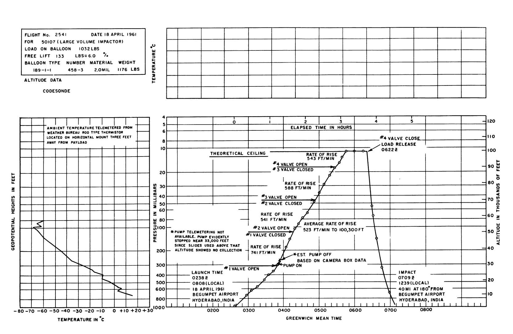 Balloon was launched on April 18, 1961 at 8:08 local time from Begumpet Airport, near Secunderabad using dynamic method. Rate of rise to 100.300 ft was 523 fpm. Telemetered tropopause temperature was -69°C at 54,000 ft. Once again rpm telemetering was not obtained. It was therefore not known whether the motor and pump were operating during the course of the flight. The system floated at 100.300 ft for a normal duration of 30 min, after which the flight was terminated. Impact occurred 40 miles south from the launch site.