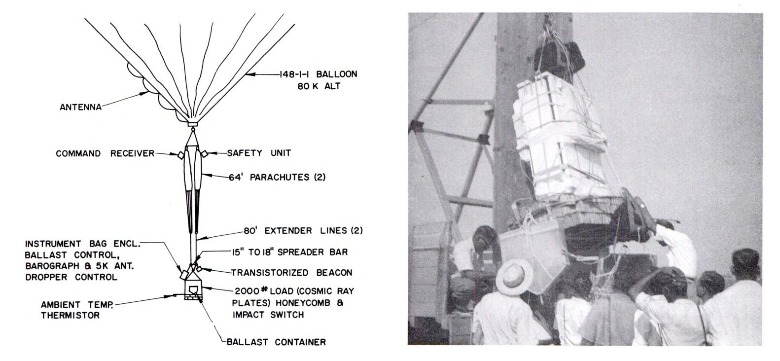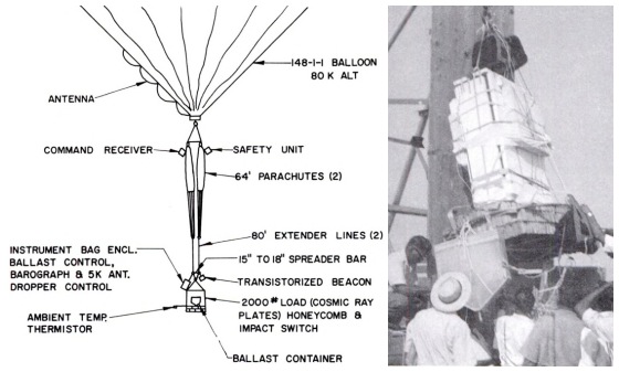 The main goal of this particular flight was to study cosmic radiation by exposing a heavy nuclear emulsion stack for an extended period of time in the stratosphere. The emulsion-tungsten assembly with a weight of 2000 lbs, was part of a joint research programme on nuclear interactions at very high energies between the Tata Institute of Fundamental Research from India and the Bristol University from England. In accordance with arrangements made during negotiations for the program, this stack was to be flown on a U.S. balloon with Indian-furnished hydrogen lifting gas and to float for 24 hr at 80,000 ft. As the program progressed, it became apparent that sufficient helium would be available for this flight, making the operation that much simpler and less hazardous. At left we can see an scheme of the flight train along with an image of the emulsion pack before launch.