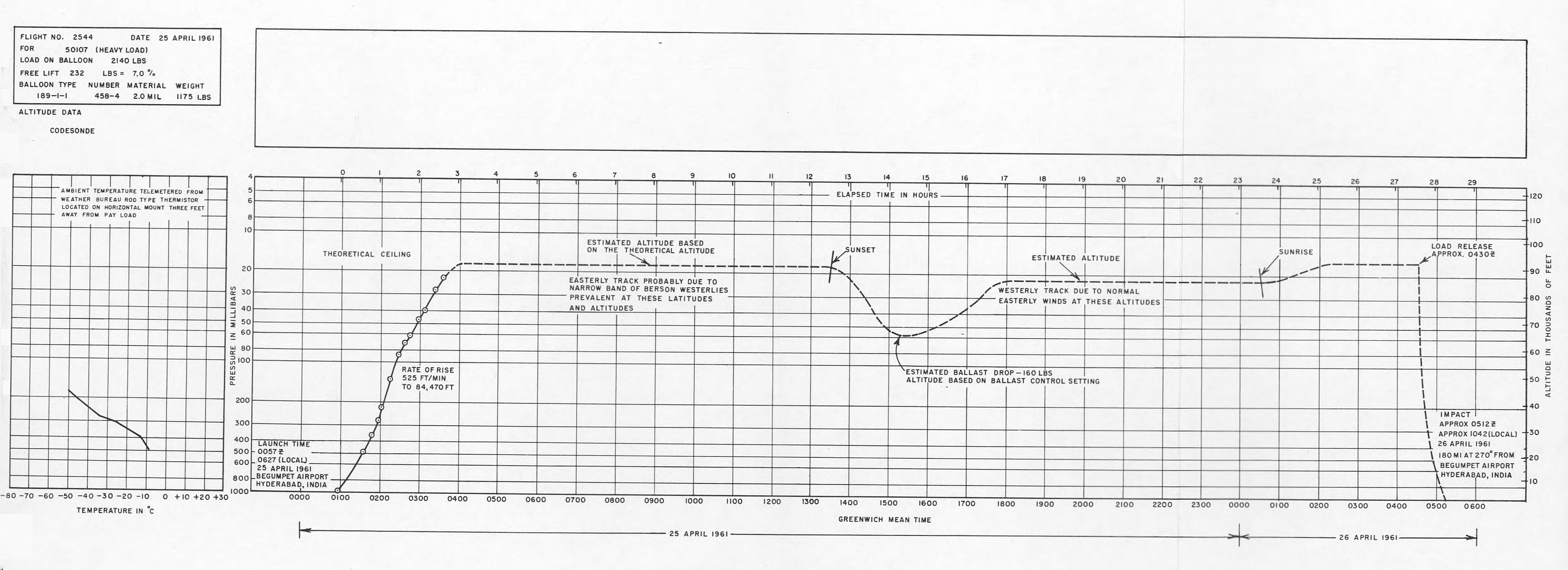The balloon was launched on April 25, 1961 at 6:27 local time from Begumpet Airport, near Secunderabad using dynamic method. Rate of rise to 89.500 ft was 525 fpm. Telemetered temperature on ascent ceased at 41,000 ft, and telemetered altitude ceased at 84,470 ft. The float altitude was based upon theoretical altitude of the balloon with this payload. The balloon floated throughout the daylight hours on 25 April and its trajectory brought the system dangerously close to the east coast of India. An attempt to terminate the flight at this point failed. As darkness descended, the balloon of course began a slow descent, due to the sunset effect. The ballast system was set for 65,000 ft, at which point the ballast would be dropped and the system would once again ascend. Since altitude telemetry had ceased, the actual altitude of ballast drop and subsequent altitude attained after ballast drop is not known. The altitudes shown on the time vs altitude curve above are estimates. The descent of the balloon to a lower altitude after sunset reversed the direction of the trajectory and the system began moving toward the west. At the following sunrise the balloon was found near the west coast of India. The termination timers were due to run out at approximately 7:00, but did not actually release the payload until 10:00. The timers evidently slowed to some extent during the night, because of extremely cold temperatures experienced in the absence of solar radiation. Impact occurred 180 miles west from the launch site at 10:42, and the payload was recovered.
