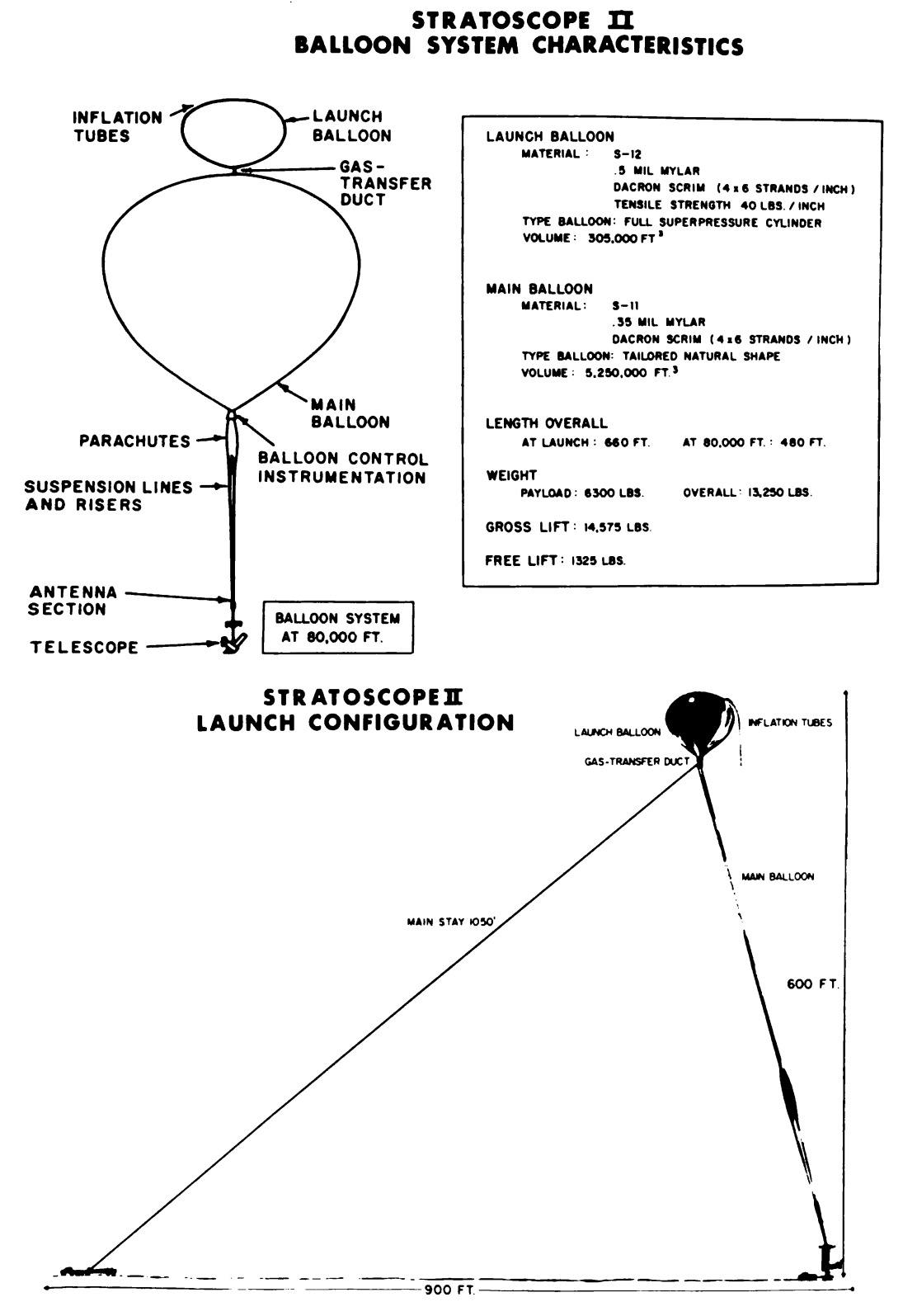 In planning Stratoscope II, one of the prime considerations was to construct a balloon strong enough to lift such a heavy weight to the required altitude of 80,000 feet. Polyethylene film, commonly used for balloons, was then limited to a load-carrying capacity of about 4,000 pounds, and thus was unsatisfactory for the project. To meet this problem, the G.T. Schjeldahl Company of Northfield, Minnesota under contract to ONR, developed a reinforced laminated plastic film having high tensile strength and tear resistance. Schjeldahl also developed, a new balloon system capable of lifting the heavy telescope payload off the ground quickly while remaining unbuffeted by ground winds as high as 15 knots.