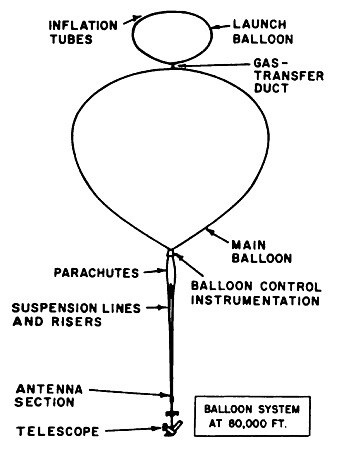 As we can see in the scheme at left (click for more details) the system employed two balloons -a small one and a large one, with the former mounted on top of the latter. The small balloon was composed of a 0.5 mil Mylar and dacron laminate called S-12 with a volume of 250,000 cubic feet. The main balloon consisted of a 0.3 mil Mylar and dacron material known as S-11 with a volume of 5,250,000 cubic feet. The two balloons were connected by a 2-1/2 foot metal tube, 3 feet in diameter, attached to a 3-foot hole in each balloon.