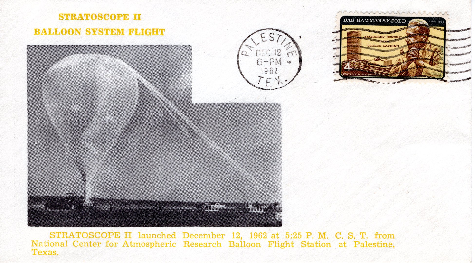 The tandem balloon system was launched at 17:25 CST on December 12, 1962 from Palestine, Texas, on the grounds of the future NASA balloon base, then operated by NCAR. This was the first full-scale test flight, for the Stratoscope II project using a mockup of the real telescope.